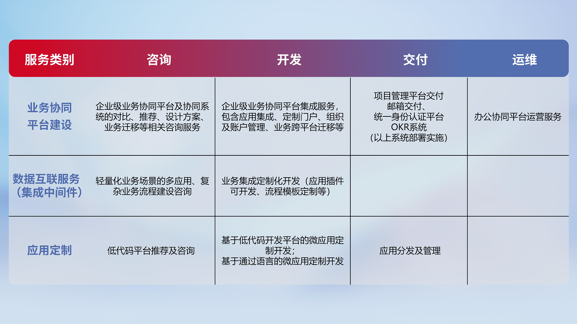 针对钉钉、、、、企微、、、、IDaas等平台级产品提供产品的规划、、、方案、、交付、、定制化开发等服务,,,实现如统一协同办公、、、智能客户服务、、、混合会议管理、、智能数据查询、、等业务场景,,,实现数字化转型。。